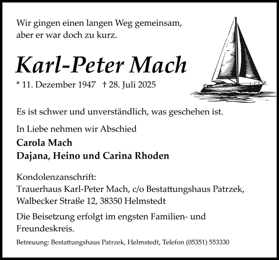 Es ist schwer einen geliebten Menschen auf solch tragischer Weise zu verlieren. Wir die Familien Mach aus dem Ruhrgebiet wollen Dir und Deinen Kindern und Enkel unsere tiefe Anteilnahme aussprechen.