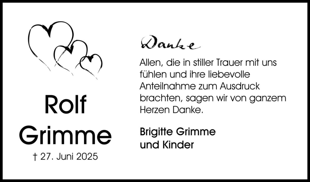 Wenn man einen geliebten Menschen verliert, gewinnt man einen Schutzengel dazu. Liebe Familie Grimme, auch wir sind traurig über den Tod Eures lieben Rolf. Wir wünschen Euch viel Kraft in der schweren Zeit. Auch wir werden Rolf nicht vergessen. Helga und Hans-Jürgen Alsleben.