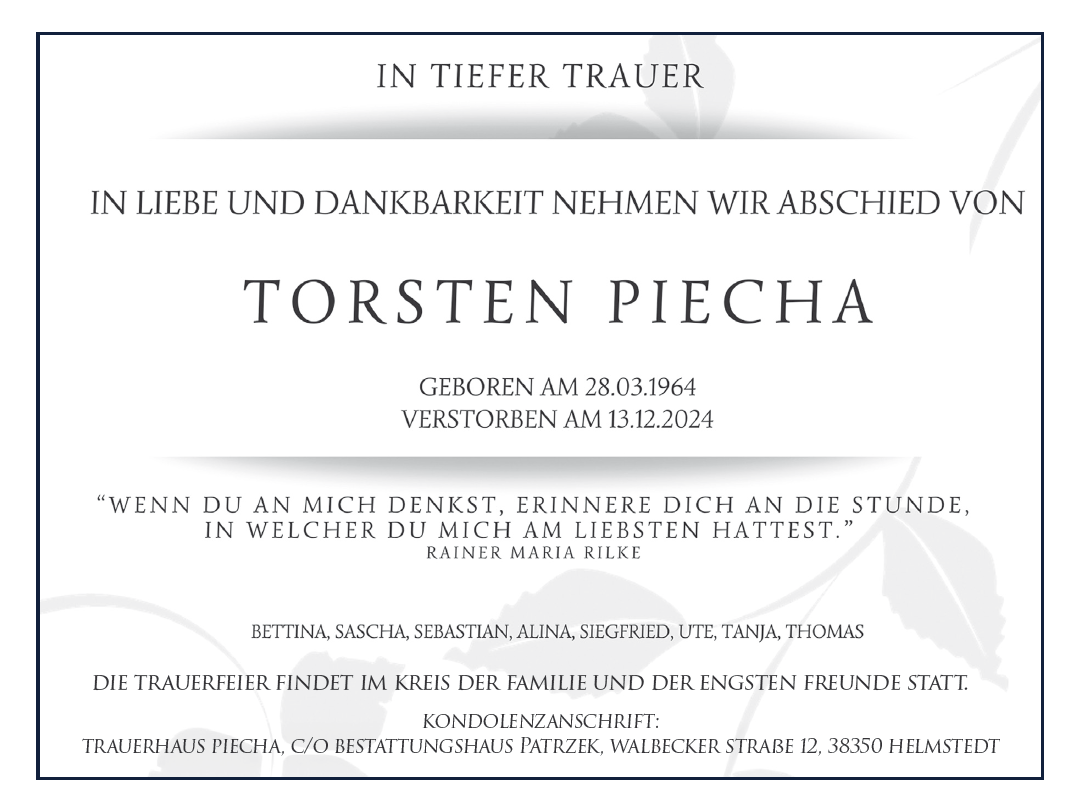 Torsten war ein sehr liebevoller und fürsorglicher Mensch. Die Menschen die ihm am Herzen lagen konnten immer mit ihren Sorgen zu ihm kommen, denn er hatte immer ein offenes Ohr für sie. Selbst wenn es ihm nicht so gut ging, hat er sich das nicht anmerken lassen, da er ein stolzer Mann war. Seine Leidenschaft war das Motorrad fahren, sportliche Autos und seine Hunde die ihn über sehr viele Jahre begleitet haben. Auch wenn das Leben es manchmal nicht so gut mit ihm meinte, hat er es gemeistert und bis zum Schluss immer den Blick in die Zukunft gerichtet und Pläne gemacht. Wir werden Dich schmerzlich vermissen und uns immer an Dich erinnern was für ein toller Mensch Du warst.