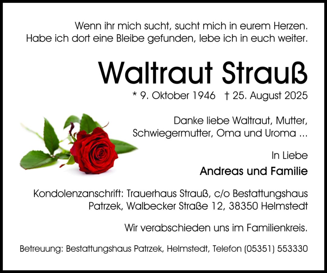 wir wünschen Ihnen von Herzen viel Kraft, dass Sie Menschen um sich haben, die Ihnen in dieser schweren Zeit beistehen und Halt geben. Zusätzlich können Sie auf dieser Gedenkseite Erinnerungen teilen und so das Andenken gemeinsam wachhalten.